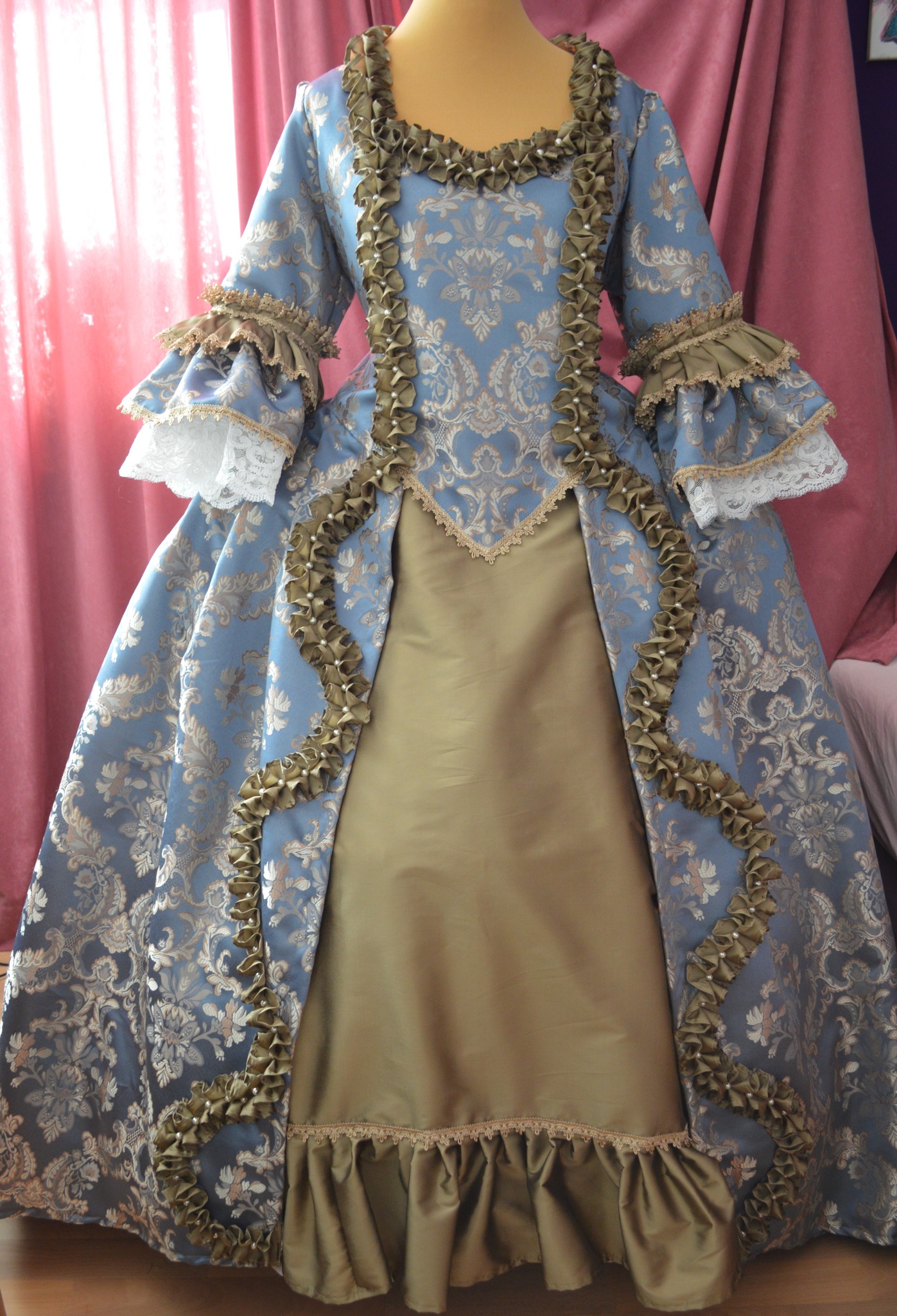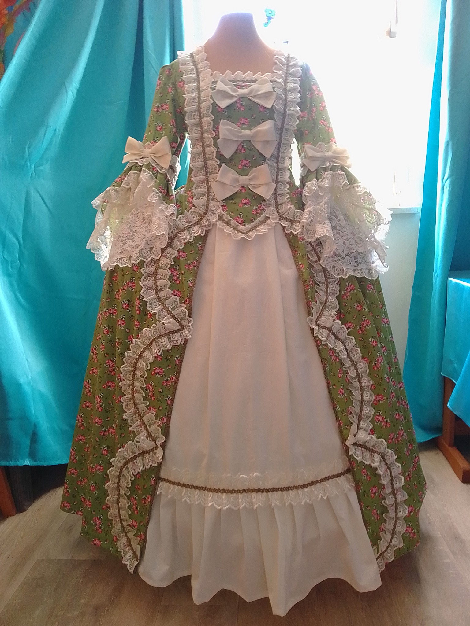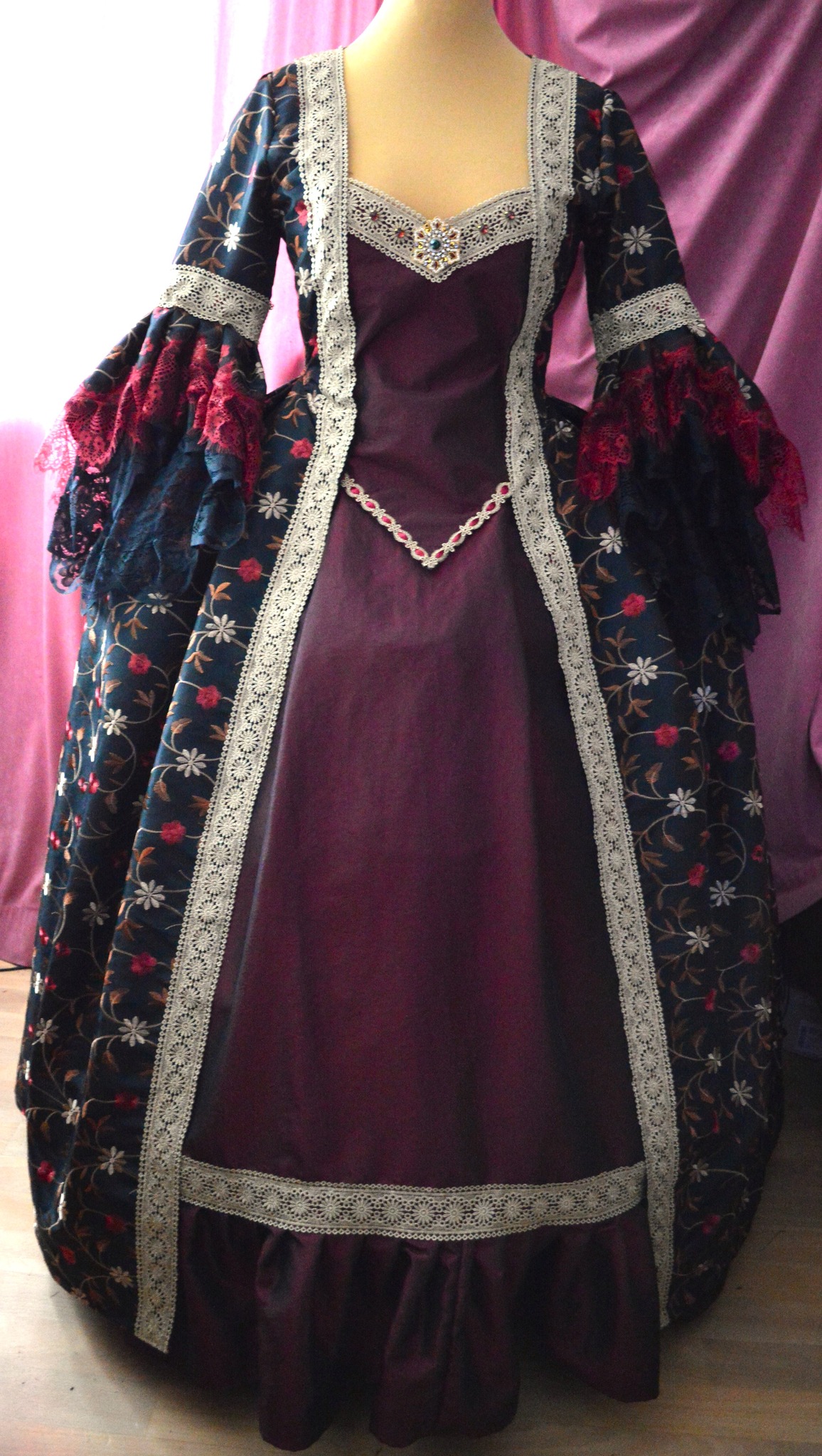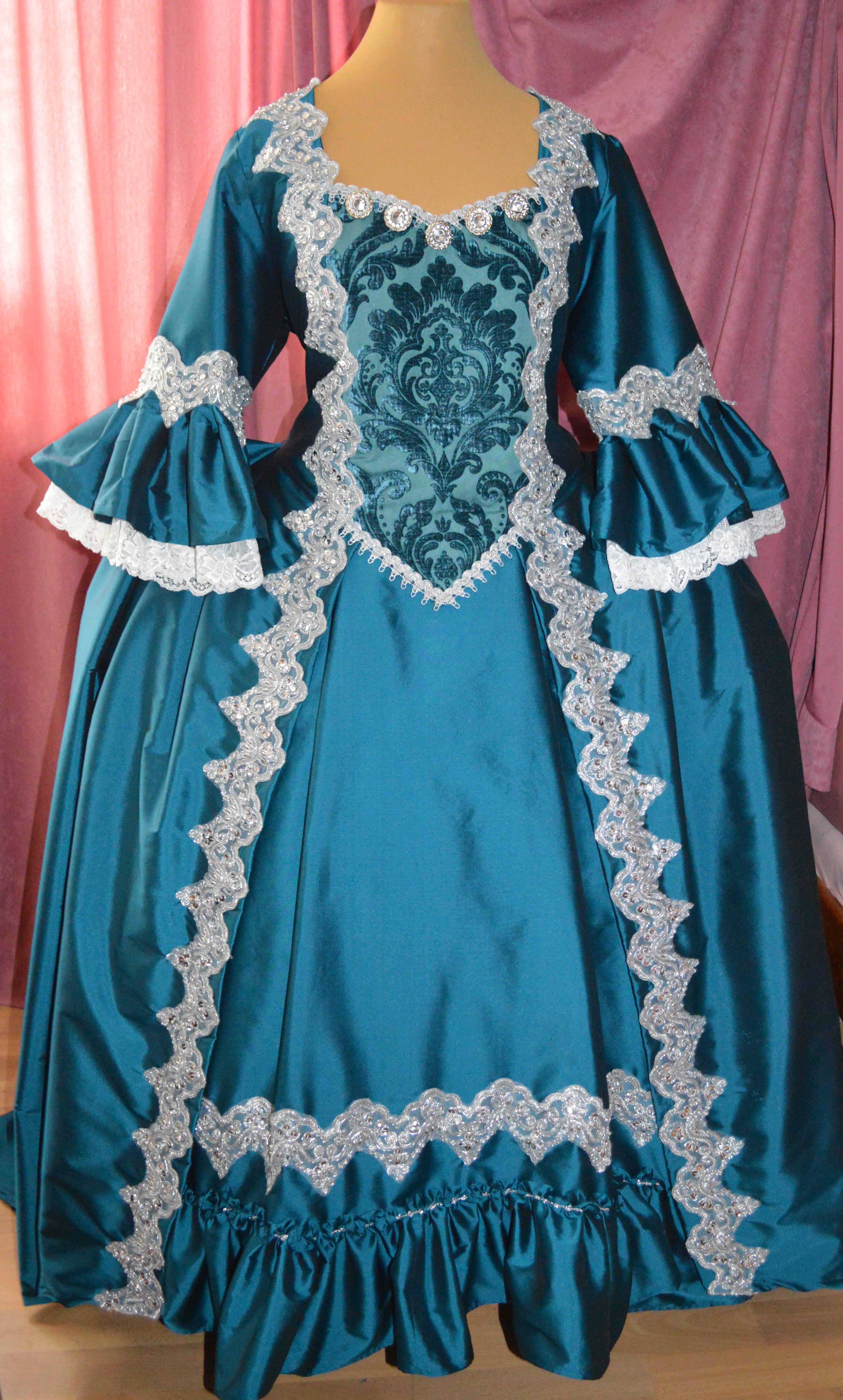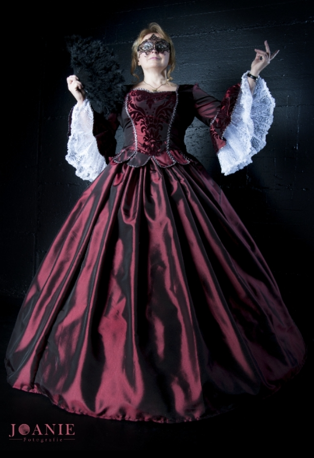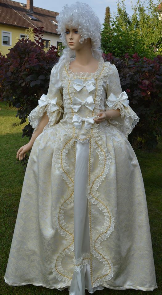 Kleid Antonia wird aus Brokat, Taft, Spitze und Borte angefertigt. Es besteht aus Oberkleid und Rock. Oberkleid wird hinten mit Schnürung angepasst.